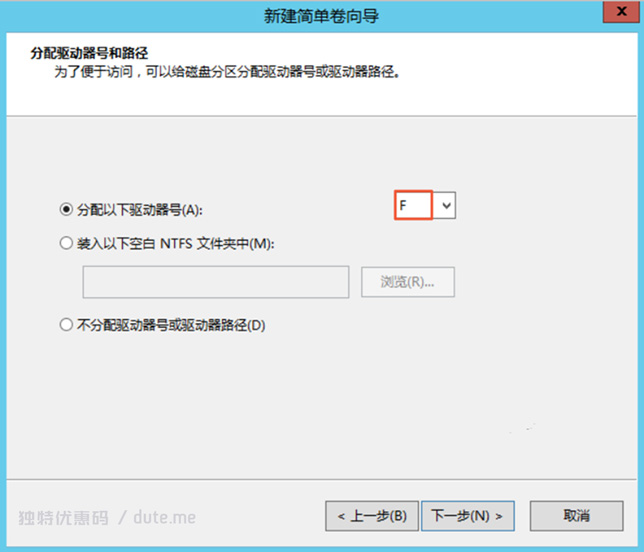 F作为磁盘盘符,即 F 盘,然后,点击下一步;